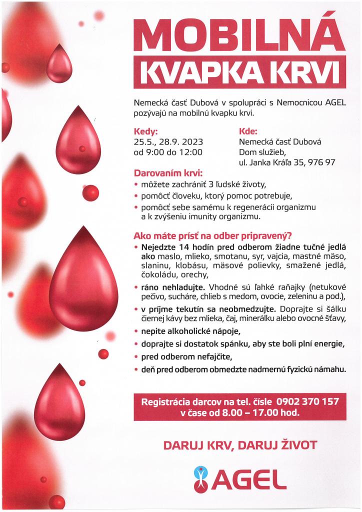Obec Nemecká v spolupráci s Nemocnicou AGEL Vás pozývajú na mobilnú kvapku krvi. Darovanie krvi sa uskutoční v Dome služieb v časti Dubová, Janka Kráľa 35: